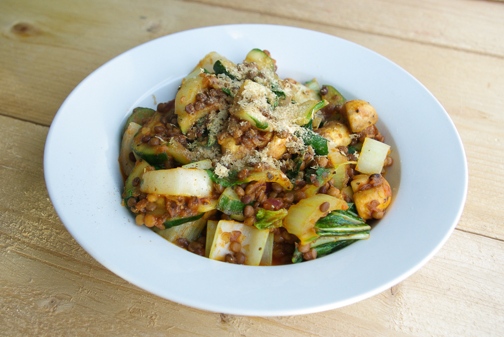 - Voeg was de paksoi en snijd in reepjes. Roer deze samen met de linzen de laatste 5 minuten door de de courgette en champignons.